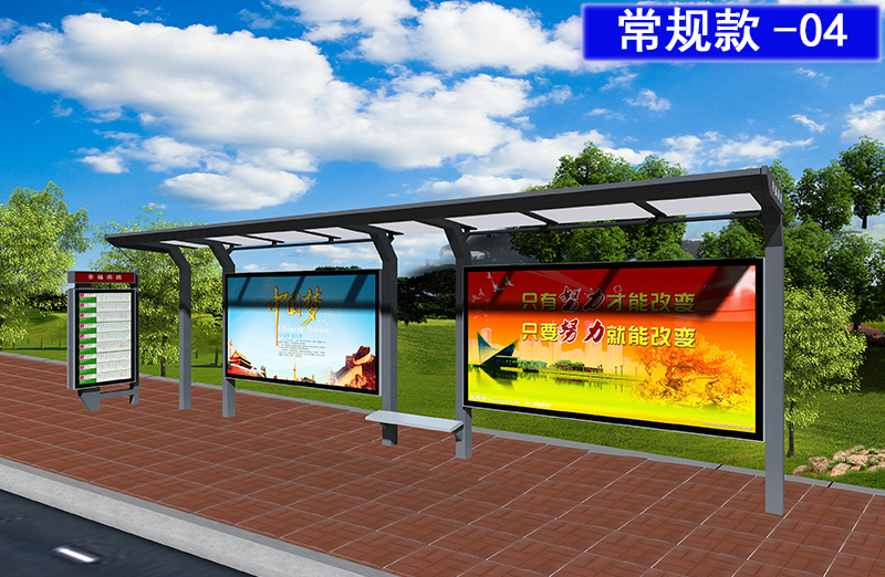 常规候车亭按照材质可分为碳钢喷涂候车亭、不锈钢候车亭、铝合金结构候车亭、木结构候车亭候车亭的结构候车亭总体分为三大结构,顶棚、立柱、灯箱、在不同款式的组合搭配中灯箱可以算的上标准件。城市候车亭,任何款式都带离不开候车亭灯箱。